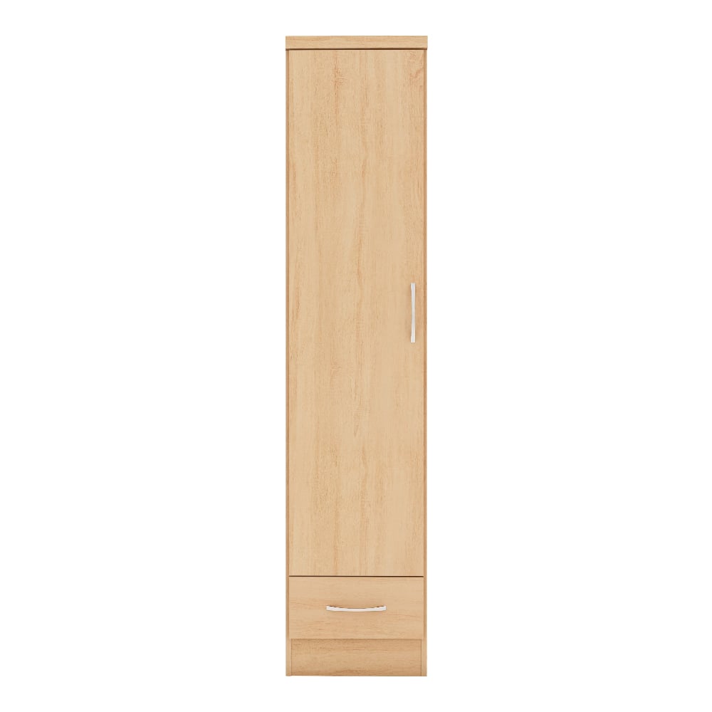 Perfect for smaller bedrooms, guest rooms, or hallway spaces, the Modara wardrobe features a single hinged door that opens to reveal a full-height hanging area for clothes and accessories, complemented by a spacious bottom drawer for folded garments or essentials. Its sturdy wooden frame, metal handle detailing, and clean-lined silhouette make it a refined and practical addition to any home.