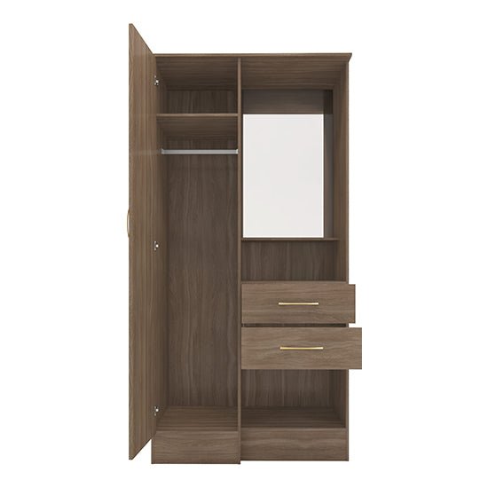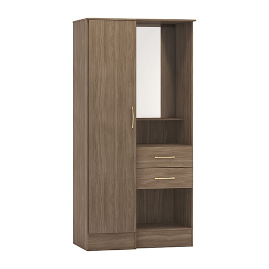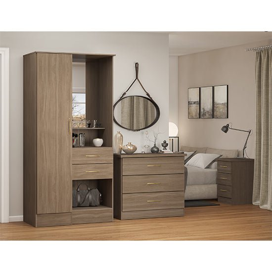 The rustic oak finish introduces warmth and texture without overpowering the room. A full-height mirror panel enhances light reflection and provides a practical dressing surface, reducing the need for additional mirrors elsewhere in the space.