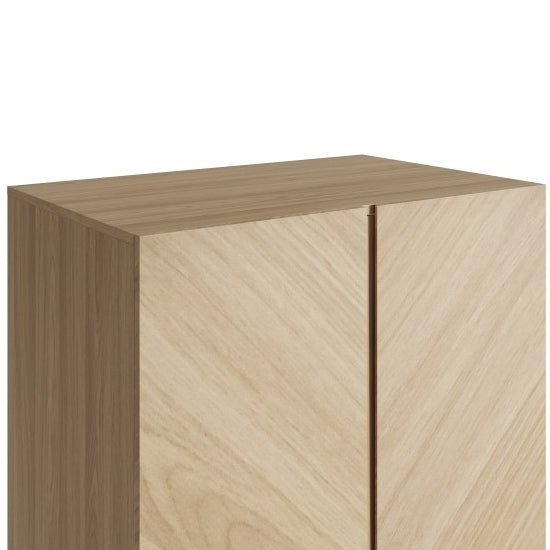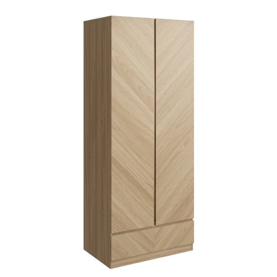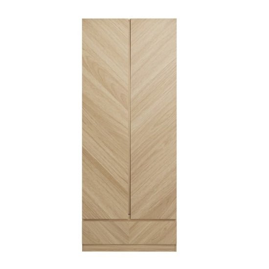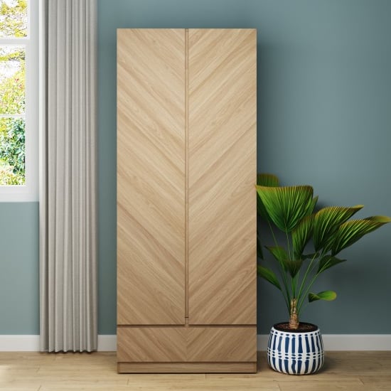 Cianna Wooden Wardrobe With 2 Doors 1 Drawer In Euro Oak, This statement two door one drawer wardrobe has a Herringbone inspired wood-grain finish. This wardrobes two, no-handle, tall doors provide easy access to a full width hanging rail and deep top shelf. The full width bottom drawer on metal runners offers easy access to your additional storage. This wardrobe arrives ready to assemble with instructions included.