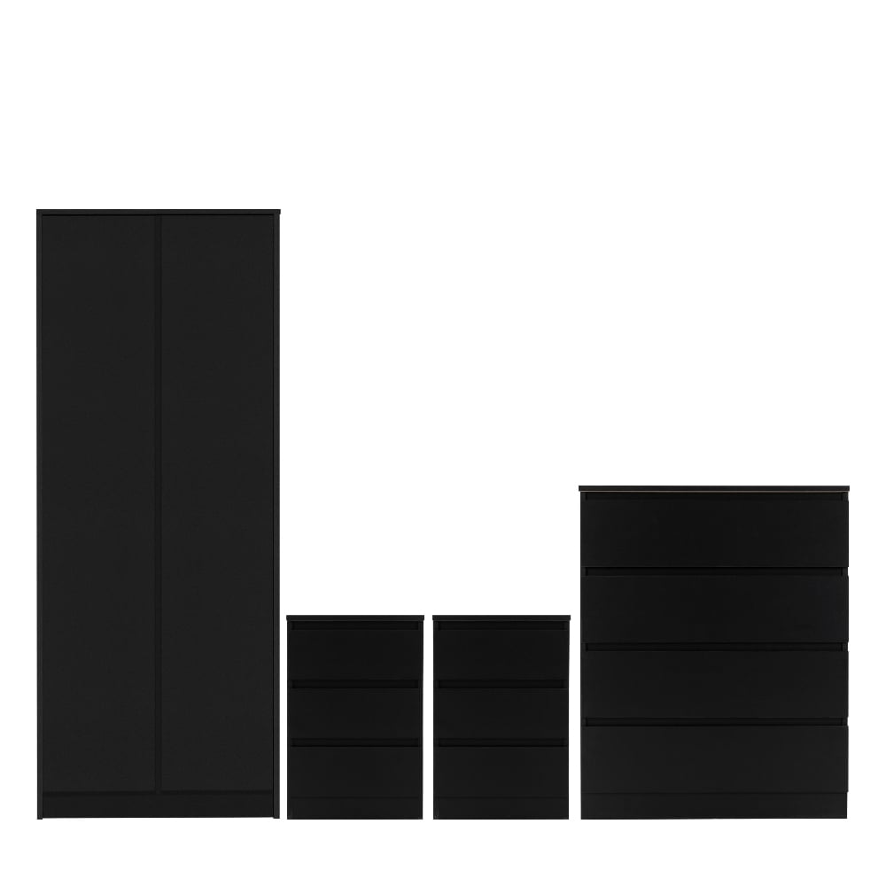 - Complete 4-Piece Set: Includes 1 x 2-Door Wardrobe, 1 x Chest of Drawers, and 2 x Bedside Cabinets — a coordinated suite for total storage harmony.