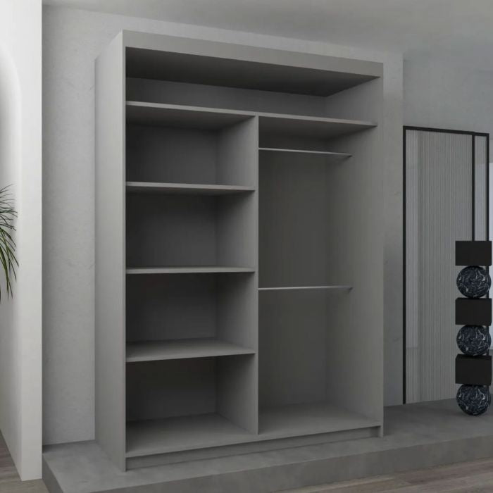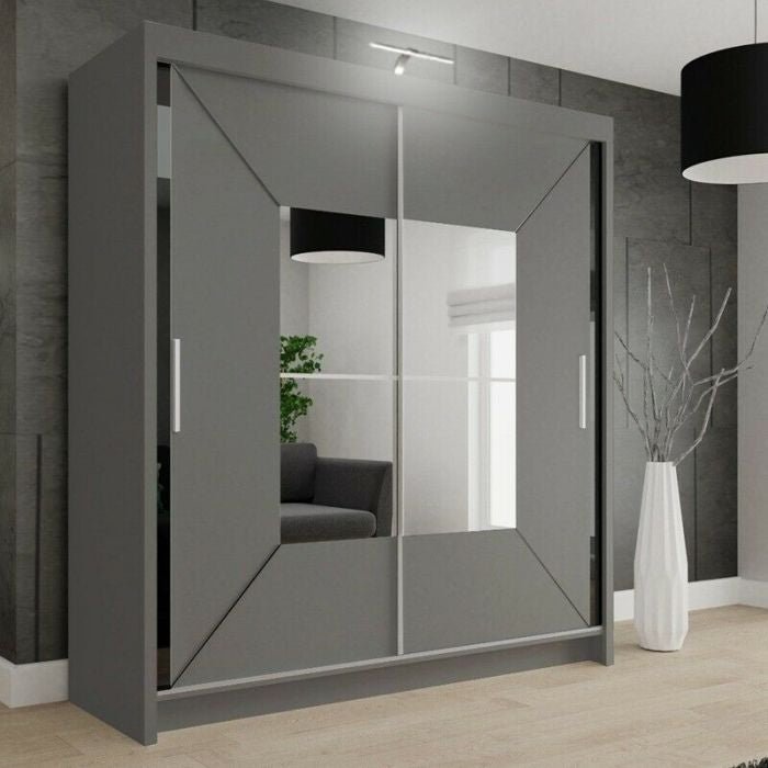 The CHOICEWARDROBE BARTHOLOMEW Sliding Door Wardrobe is a bold architectural storage piece designed to bring structure, symmetry, and modern refinement into the bedroom. Finished in matt grey, it features a distinctive geometric panel design with a central mirror, creating depth, balance, and visual interest without overwhelming the space.