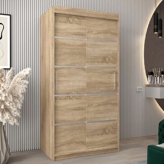 Create a calm, space-efficient bedroom layout with the CHOICEWARDROBE Vevey I Sonoma Oak 100cm Sliding Door Wardrobe. Designed for compact rooms, this wardrobe combines practical internal storage with a warm oak-effect finish that adds visual softness without overwhelming the space.