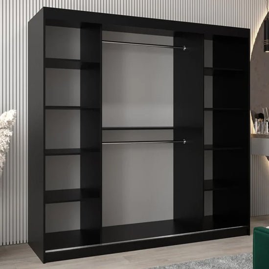 The CHOICEWARDROBE Vevey II Black 200cm Mirrored Sliding Door Wardrobe is specified and supplied by CHOICEWARDROBE, the UK’s leading wardrobe specialist. Designed for bedrooms that require generous storage without visual clutter, this wardrobe combines a dark, contemporary finish with a reflective element to enhance spatial balance.