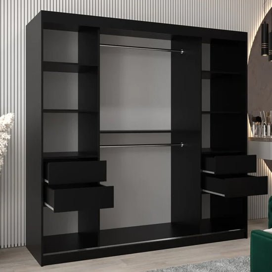 Two sliding doors form a wide, uninterrupted front elevation. One full-height mirrored panel is integrated to reflect natural and artificial light, increasing perceived room width while maintaining visual restraint. The black finish introduces depth and contrast, giving the wardrobe a confident architectural presence across wider walls.