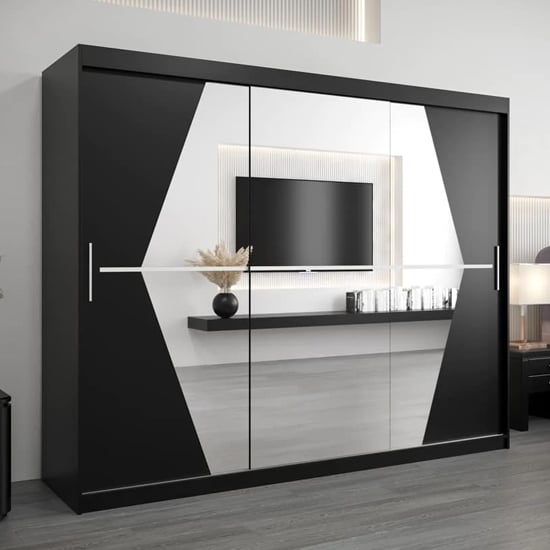 The black finish creates a strong architectural statement, while the mirrored sliding doors help reflect light and visually open up the room, making it ideal for master bedrooms and larger sleeping spaces.