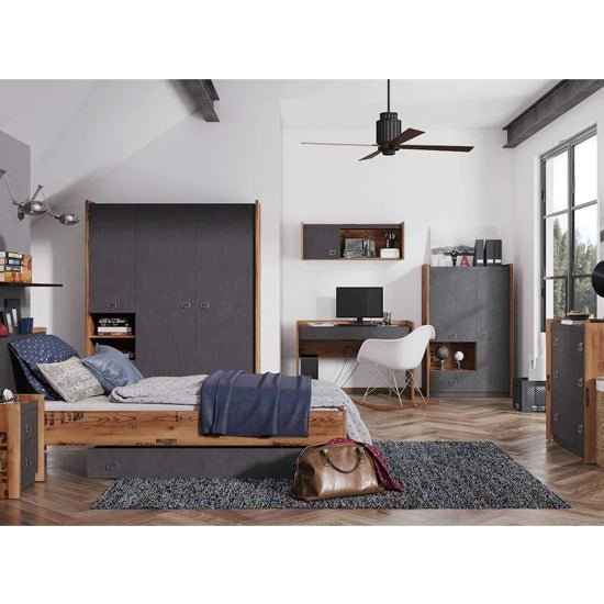 Expertly built from high-quality 16 mm laminated board, this wardrobe is made to last. The Fairbourne features three smooth-opening doors, two spacious drawers, and six internal shelves, providing versatile organisation for hanging garments, folded clothes, shoes, and accessories. Its industrial steel tones are offset by reclaimed-wood detailing, adding texture and depth that suit urban loft, Scandinavian, or modern farmhouse styles alike.