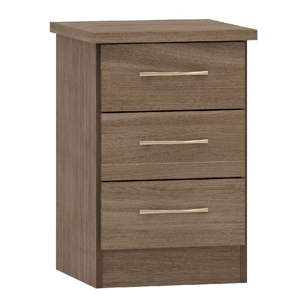 You’ll receive a 3-door mirrored wardrobe, chest of drawers, and two bedside tables — all finished in rustic oak.