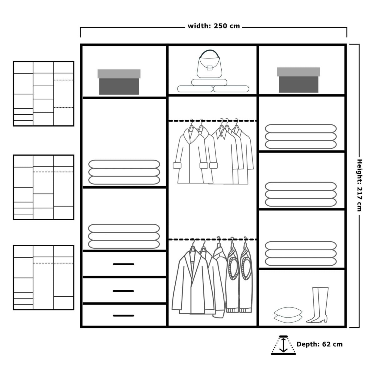 With a full 250cm width, this wardrobe is ideal for master bedrooms, shared spaces, and clothing-heavy households requiring generous internal organisation.