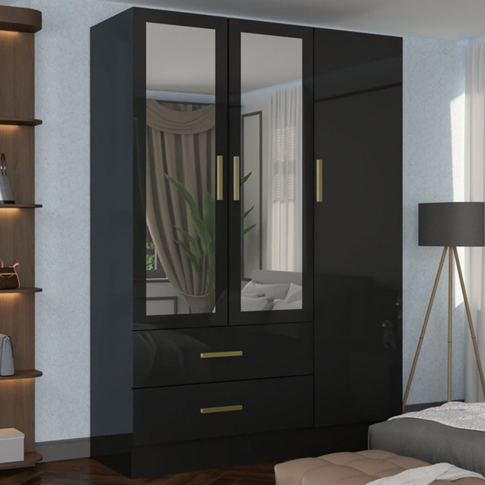 XD2 Black High Gloss 3 Door 2 Drawer Gold Handle Mirrored Wardrobe 116cm