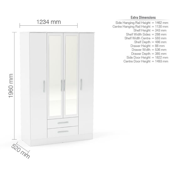 CHOICEWARDROBE Lynn 4 Door Mirrored Wardrobe in White High Gloss – 132cm Modern Storage Wardrobe with Hanging Rail & Drawers