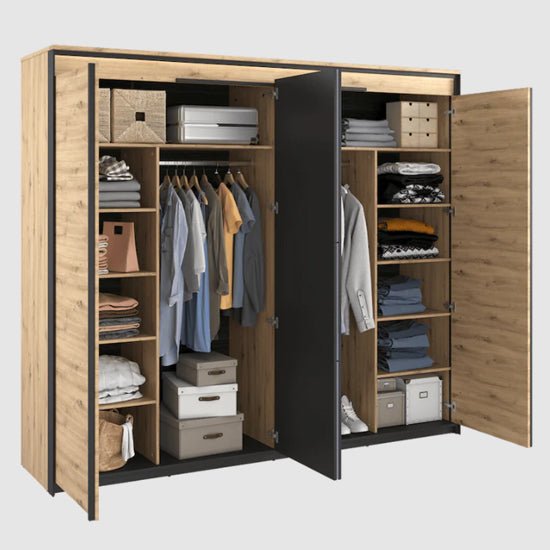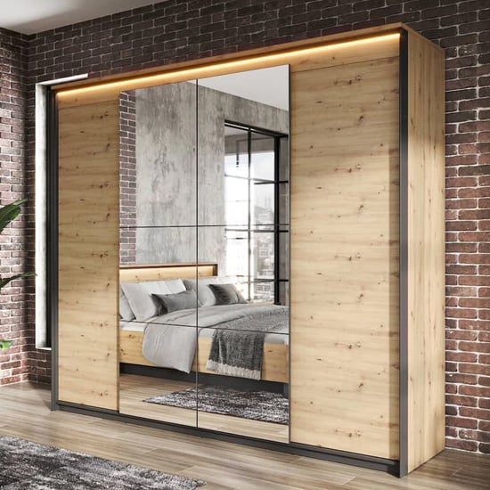 Bring structure, illumination, and refined storage into your bedroom with the CHOICEWARDROBE Qesso Mirrored Wardrobe with 4 Hinged Doors in Artisan Oak. Designed for spacious interiors, this wardrobe combines natural oak texture with architectural black detailing and integrated lighting.
