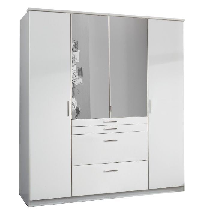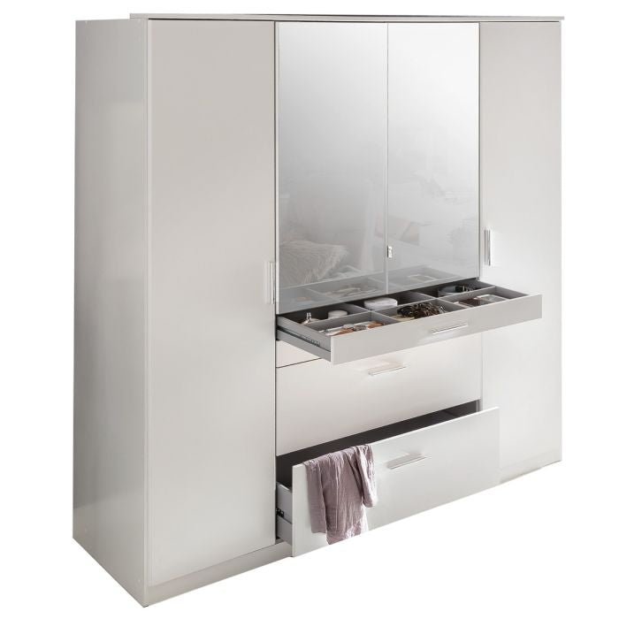 Designed for balanced storage and everyday practicality, the ACORN 4 Door Mirrored Wardrobe – 180cm in White combines hanging space, shelving, and integrated drawers within a clean, modern silhouette.