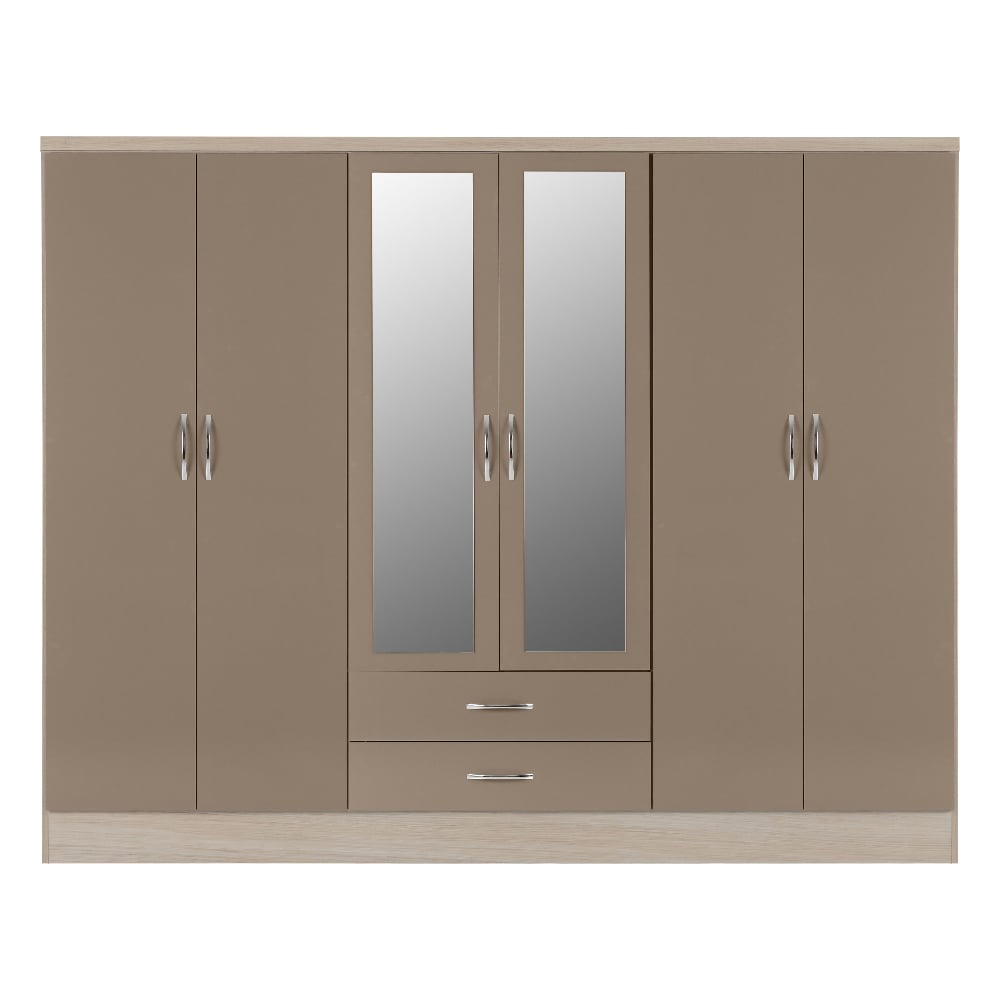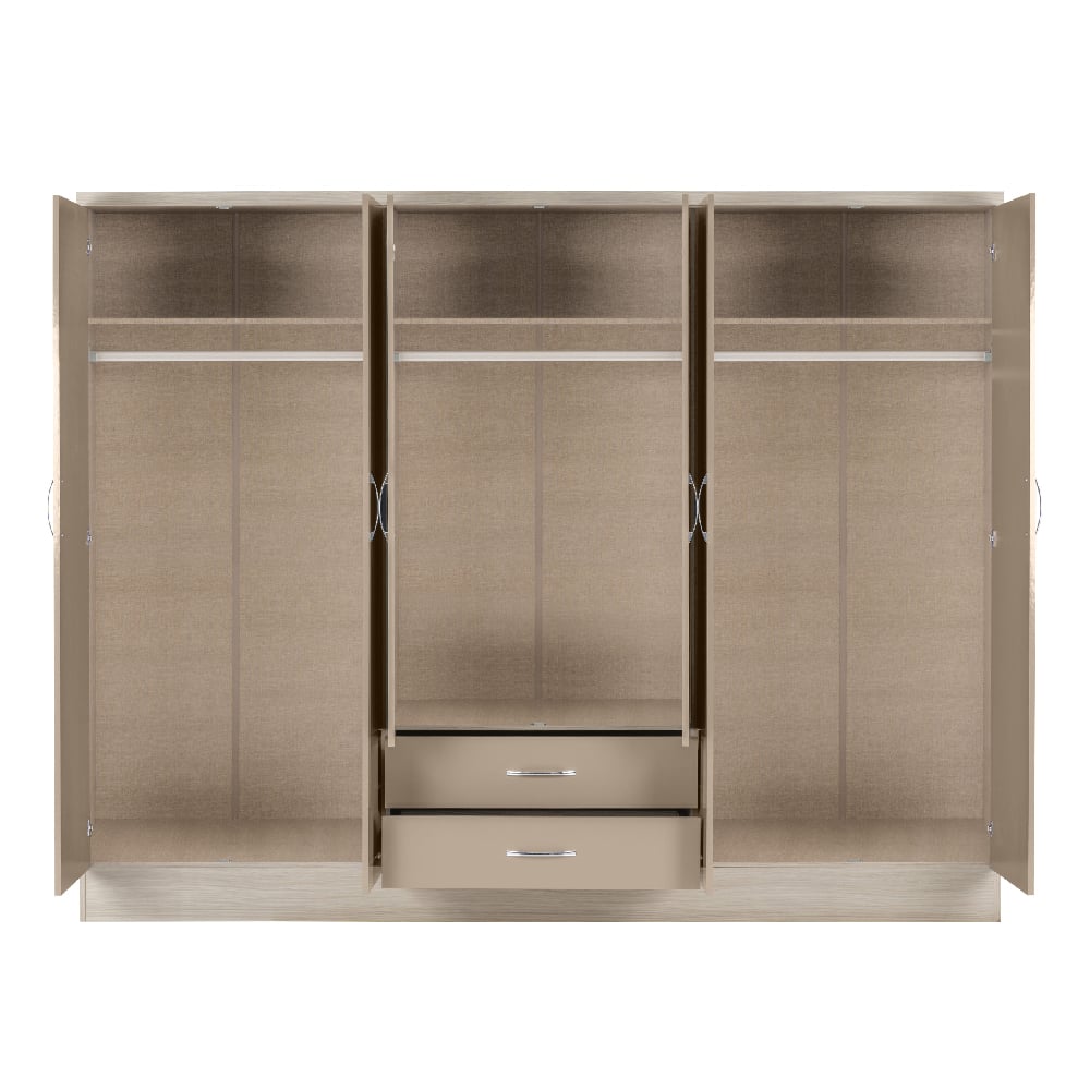 The CHOICEWARDROBE Mack 6 Door Wardrobe in Oak with Grey Gloss Front is a large-format storage system designed for bedrooms that require visual refinement and serious internal capacity. The contrast between natural oak tones and a smooth grey gloss front delivers a balanced, architectural presence suitable for modern and transitional interiors.