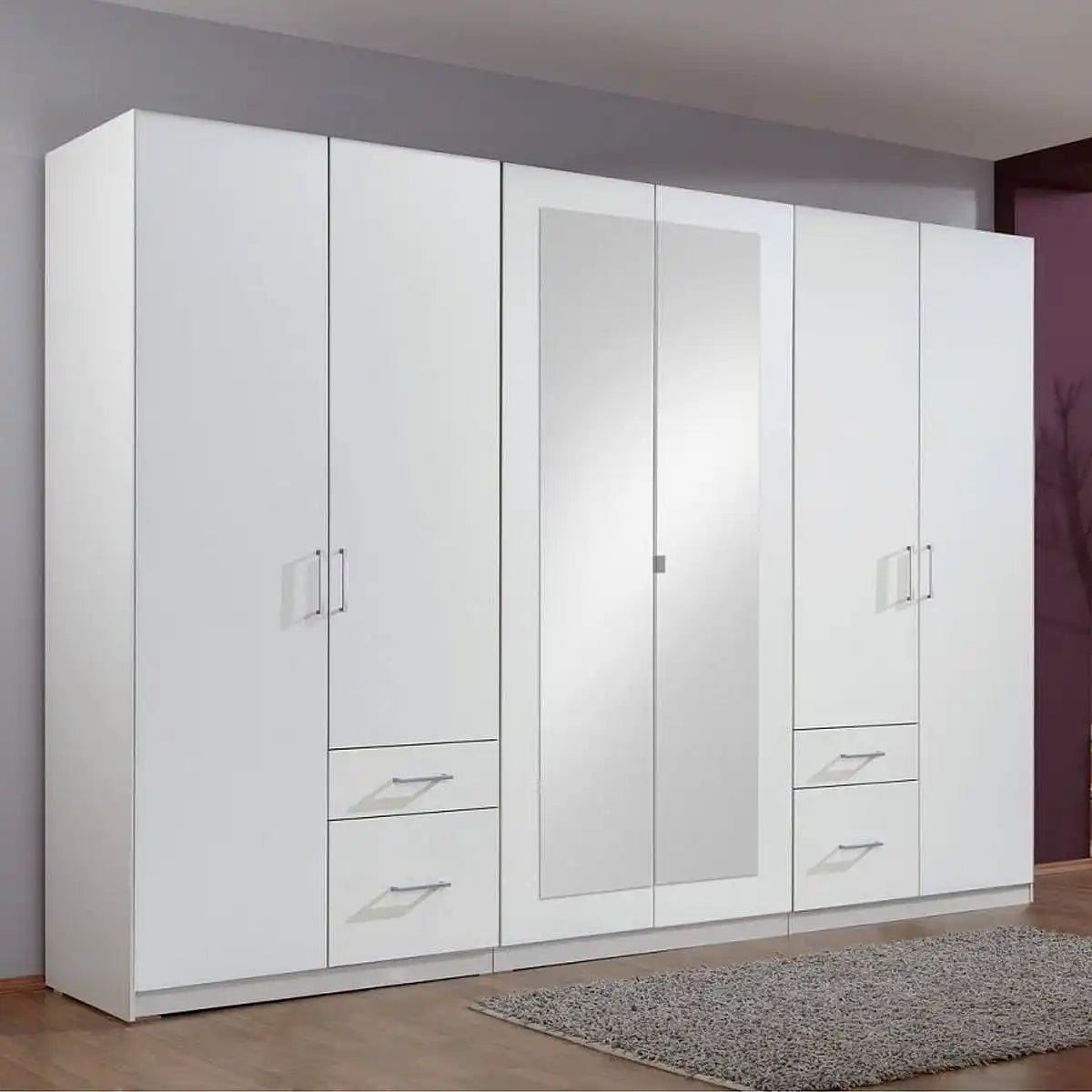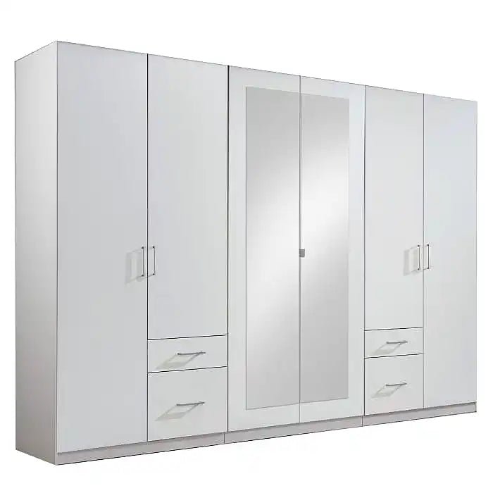 CHOICEWARDROBE Flock 270cm 6 Door Mirrored Wardrobe – White | Large Hinged Bedroom Wardrobe with Drawers & Hanging Storage
