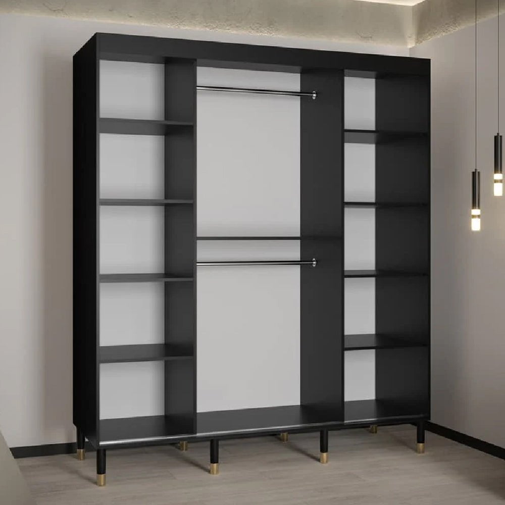 Finished in deep black with precision-milled MDF fronts, gold accent handles, and elevated wooden legs, the Millwall wardrobe presents a confident contemporary aesthetic without visual excess.