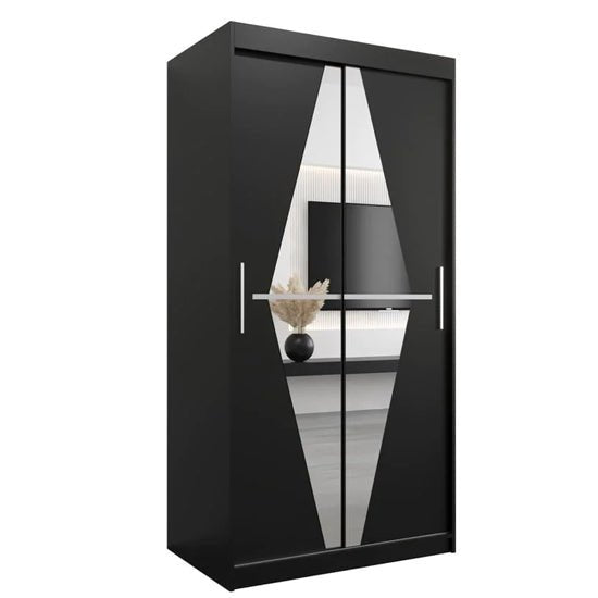 The Beloit 100cm Sliding Wardrobe delivers a striking modern look with its geometric mirrored design and sleek black finish. Perfect for bedrooms with limited space, this compact wardrobe maximises storage while maintaining a stylish, contemporary aesthetic.