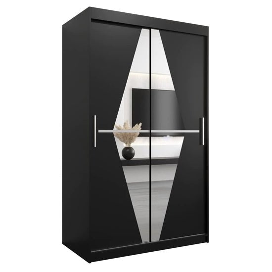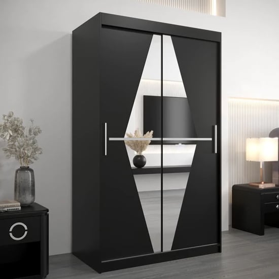 The Beloit Sliding Wardrobe delivers modern elegance and compact practicality in a bold matte black finish. Featuring a striking geometric mirror pattern across its two sliding doors, this 120cm wardrobe enhances your bedroom with both style and functionality.