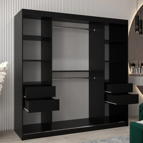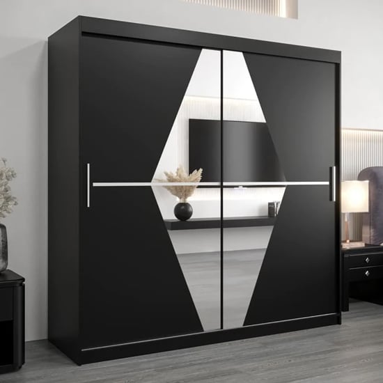 Why does the 200cm Beloit wardrobe pair a black finish with full-length mirrors?