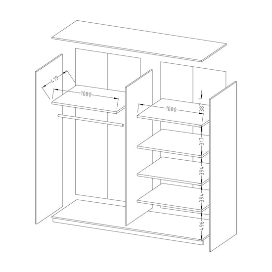 Behind the sliding doors, the Biella wardrobe is designed for balanced, everyday storage. Six internal shelves accommodate folded clothing, footwear, and accessories, while two hanging rails provide generous space for coats, dresses, shirts, and longer garments. The layout supports both shared and individual bedroom use.