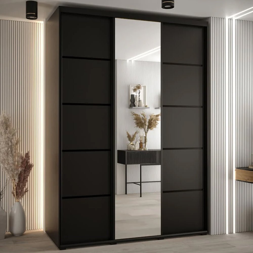 The black finish offers a sophisticated and versatile look, making a bold yet elegant statement in your bedroom decor. The inclusion of mirrored panels not only adds a touch of modern style but also helps to visually expand the room and reflect light, creating a brighter and more spacious feel. This wardrobe’s design is ideal for contemporary interiors, providing a clean and refined look.