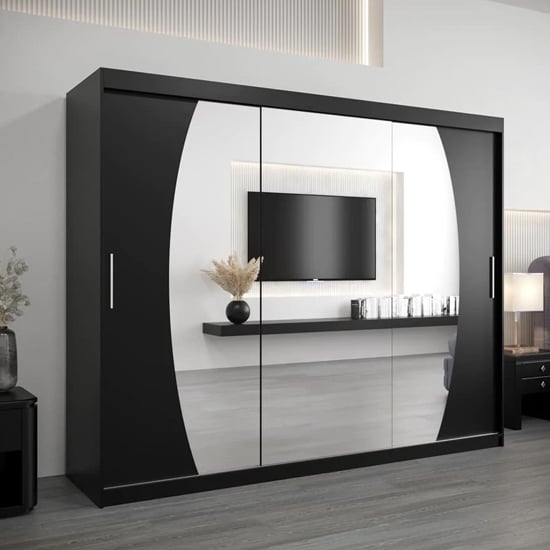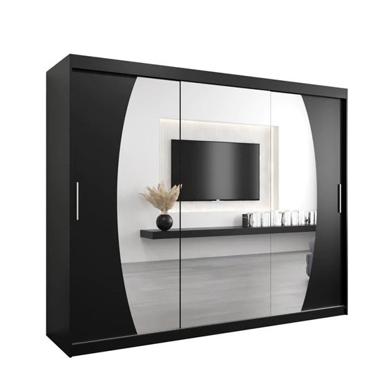 Eden Mirrored Wardrobe with 3 Sliding Doors, expertly crafted and presented by Furniture in Fashion. Designed with a compact 250cm width and finished in the charming Black, this wardrobe seamlessly blends style and functionality, making it a standout addition to your bedroom decor. The Three contemporary sliding doors not only create an illusion of space but also infuse a touch of natural charm into your living area. Step inside to discover a well-organized interior, complete with shelves and hanging rails, ensuring your clothing and accessories stay perfectly organized. The Eden Mirrored Wardrobe exemplifies the perfect union of form and practicality, making it an ideal choice for those seeking modern sophistication and convenience in their bedroom furnishings. Elevate your home decor with this exquisite wardrobe from Furniture in Fashion and indulge in daily luxury in your living space.