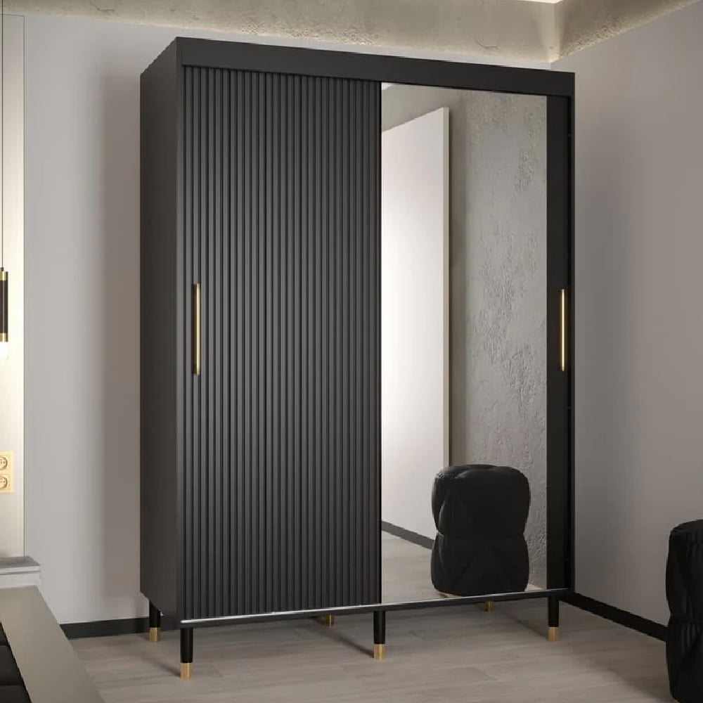 Designed for modern bedrooms where space efficiency matters, the Millwall 150cm Sliding Mirrored Wardrobe delivers practical storage in a refined Black finish with elevated detailing.