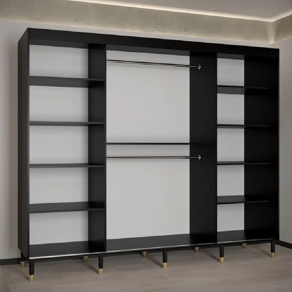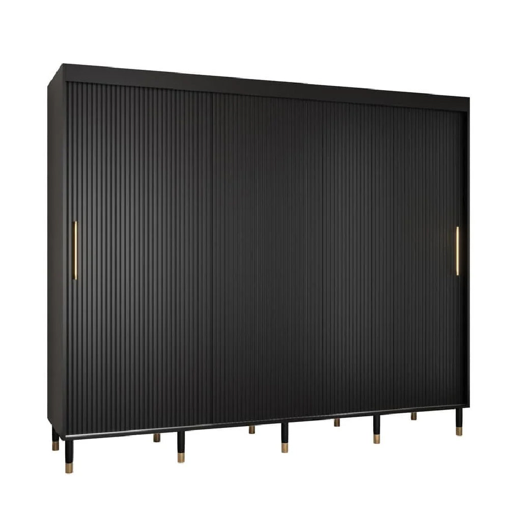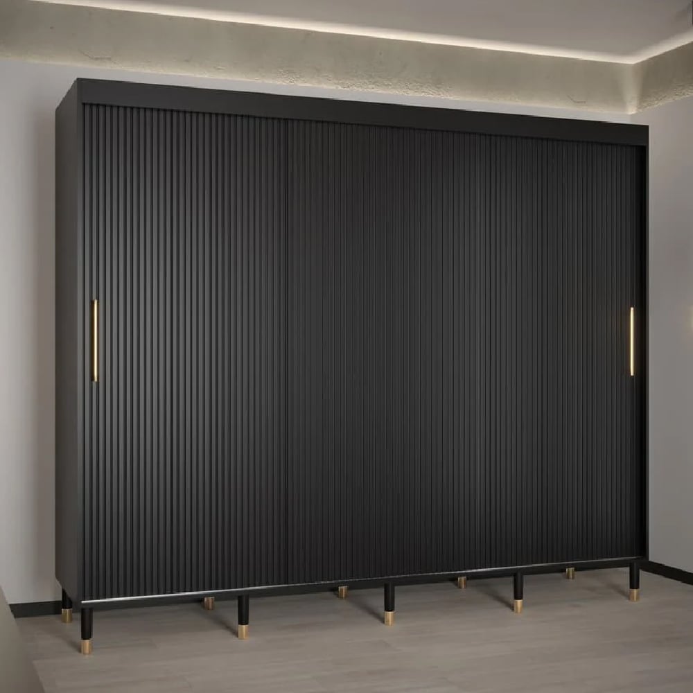 CHOICEWARDROBE Millwall 250cm Black Wooden Sliding Door Wardrobe | Fluted Panel Design with Gold Handles & Grand Luxury Storage System