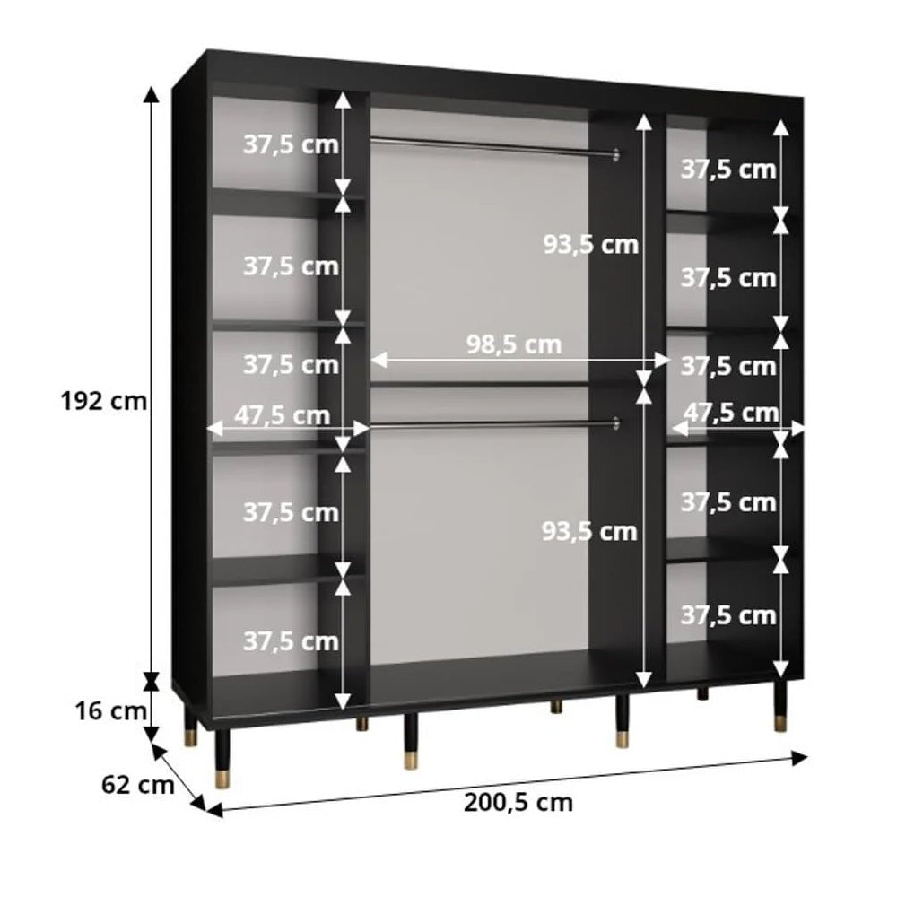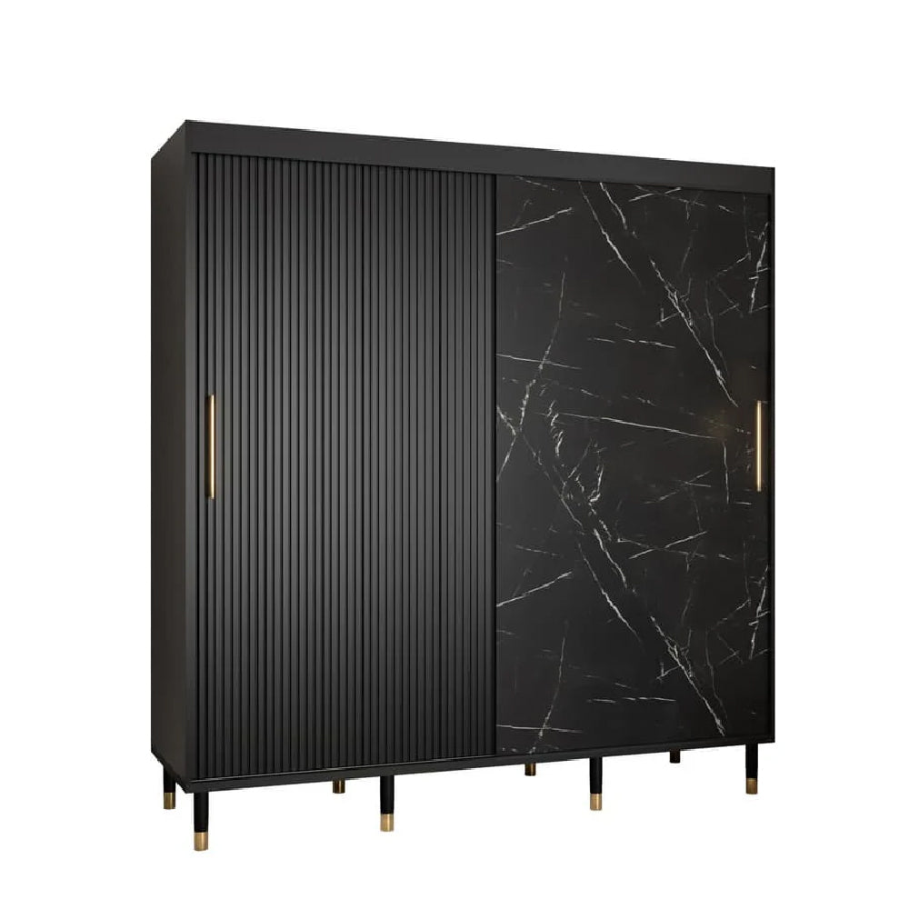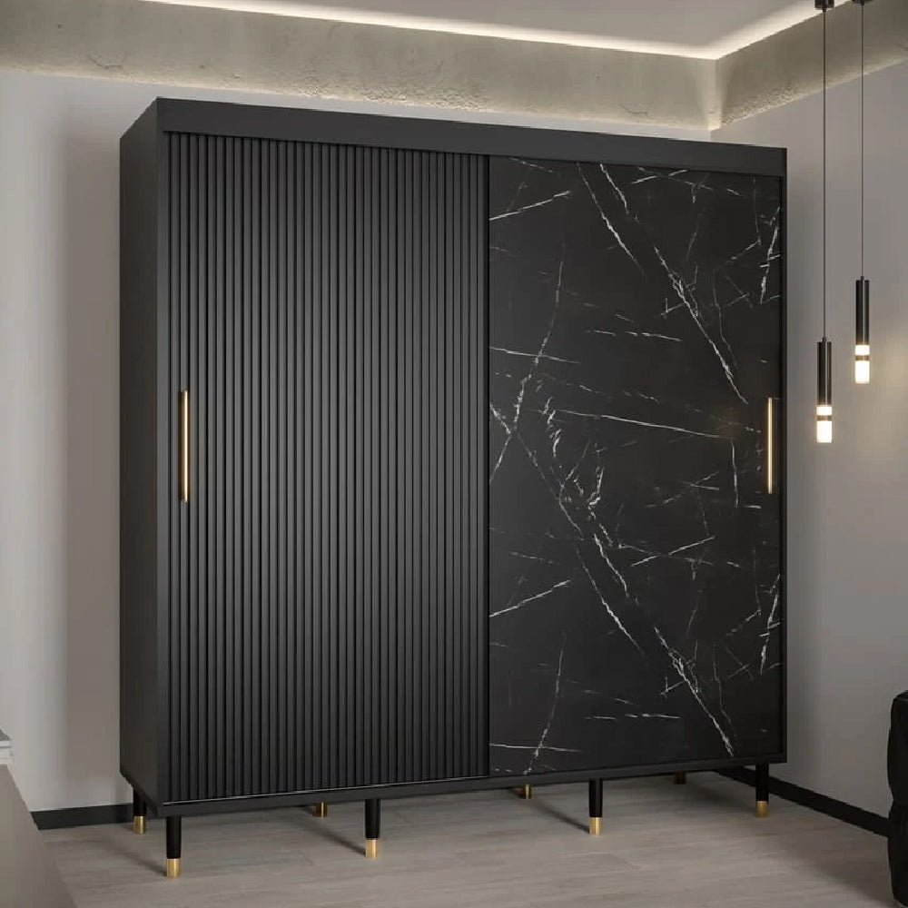 CHOICEWARDROBE Millwall 200cm Sliding Door Wardrobe – Black Marble & Ribbed Finish, 2-Door, Gold Handles
