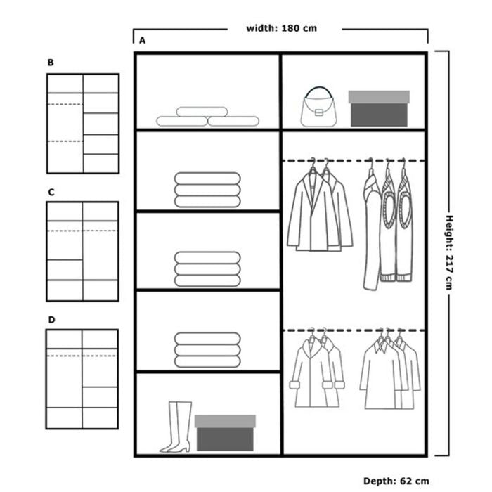 • Two full-width hanging rails for coats, shirts, and longer garments