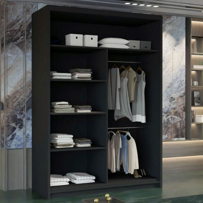 The Merica wardrobe balances strong black panels with softly contoured glass detailing, creating a composed, contemporary aesthetic. High-gloss edge finishes add contrast while preserving a clean, uncluttered appearance suitable for modern interiors.