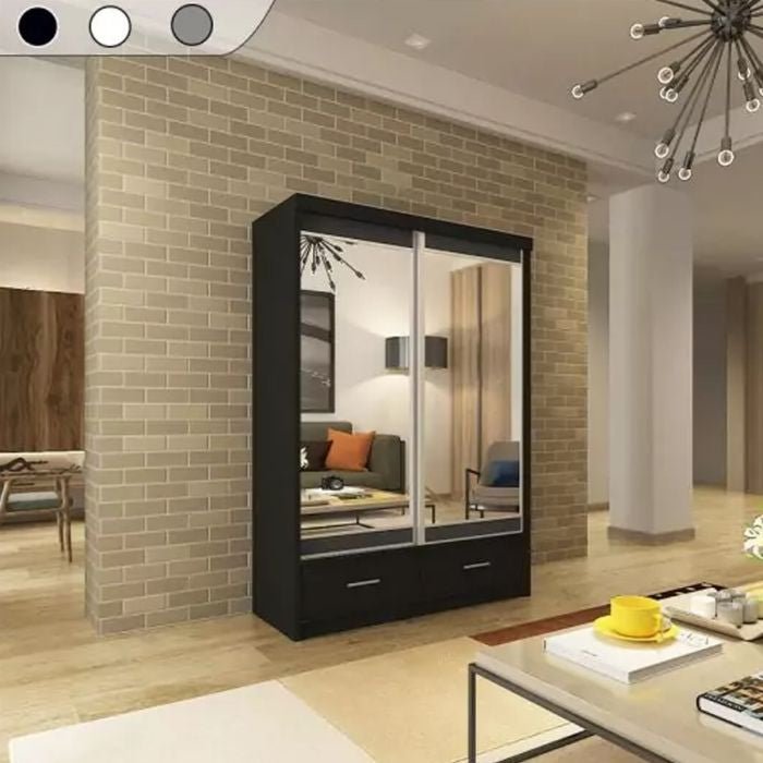 The CHOICEWARDROBE NEWRY 2 Door Mirrored Sliding Wardrobe in black offers a refined, modern storage solution designed for bedrooms where both style and practicality matter. With a 150cm width, it provides generous storage capacity while maintaining a clean, balanced footprint.