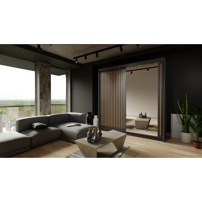 The Zeus wardrobe combines a strong architectural profile with a sleek black exterior. Mirrored doors add balance and functionality, while the sliding system maintains a streamlined appearance without door swing intrusion.