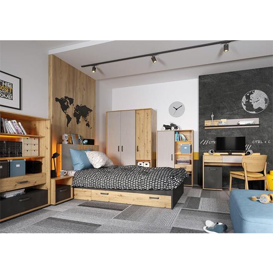 Finished in Artisan Oak with contrasting Silk Flou (raw concrete effect) detailing, this wardrobe introduces a calm, modern aesthetic that works beautifully in contemporary family homes. The balanced tones feel warm without being overpowering, making it suitable for both younger children and growing teens.