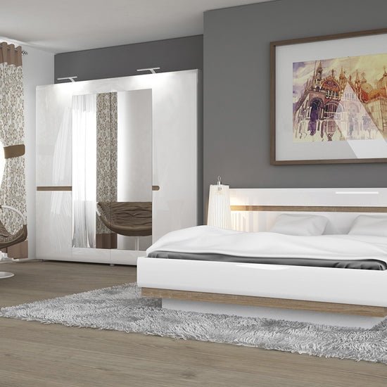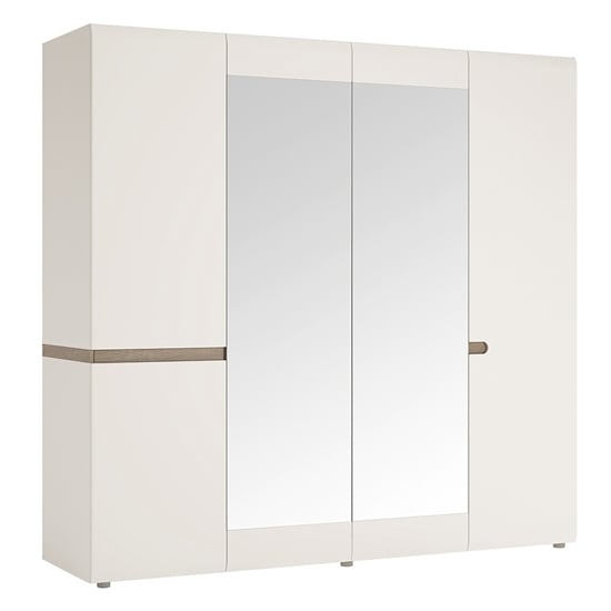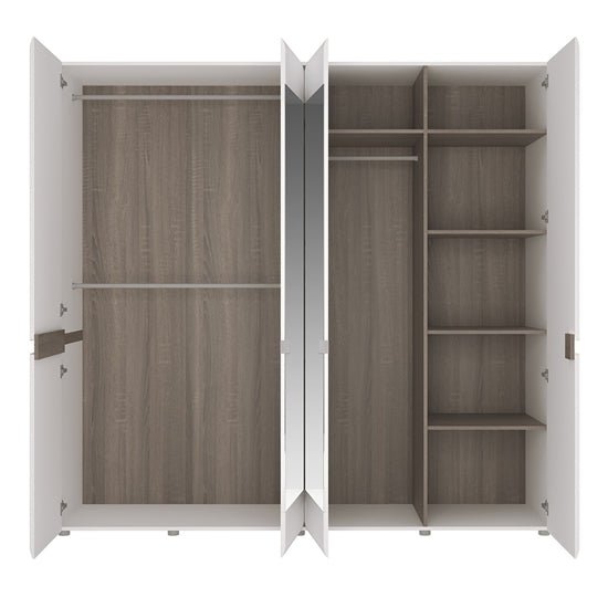 CHOICEWARDROBE Cheya 218cm 4-Door Mirrored Wardrobe – White High Gloss Finish With Truffle Oak Detailing