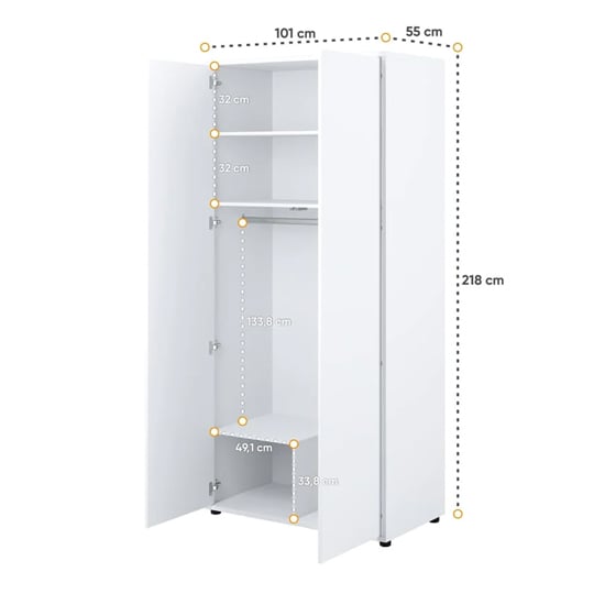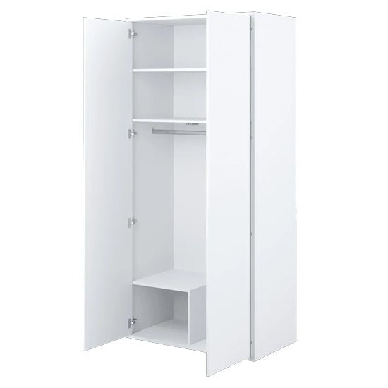 The two hinged doors use a push-to-open system, removing the need for external handles and preserving a seamless front appearance. When opened, the interior is clearly organised to support everyday clothing storage without excess complexity.