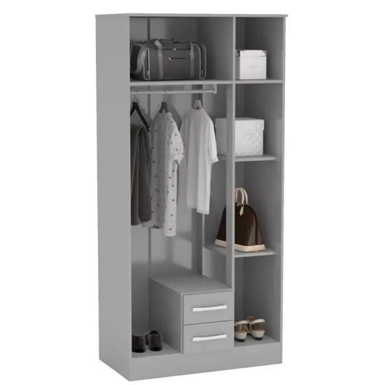The grey exterior delivers a clean, contemporary tone, while the three-door configuration provides a structured internal layout suited to everyday clothing, accessories, and folded items.