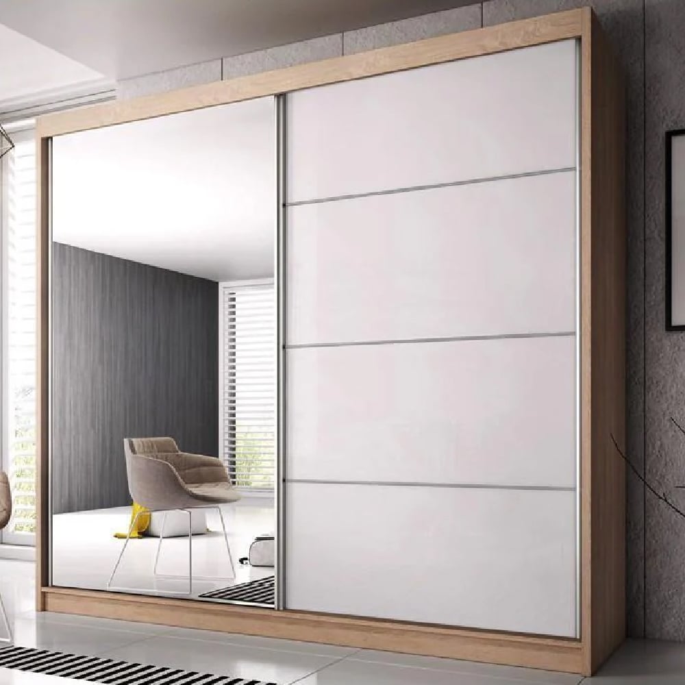 The Mesa Oak & White Gloss wardrobe introduces a balanced blend of modern and natural tones. The oak lining softens the bold white gloss, creating a look that fits both minimalist and warm contemporary bedrooms. The mirrored sliding door adds depth to the room while offering daily convenience.