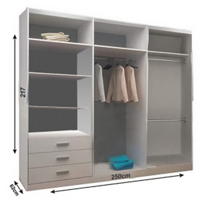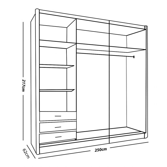 With three smooth-gliding sliding doors and a wide 250cm frame, the Moncler offers generous internal organisation without compromising floor space. The mirrored centre panel enhances light and depth, making the room feel brighter and more open.