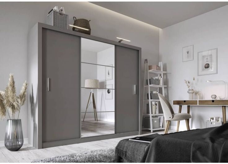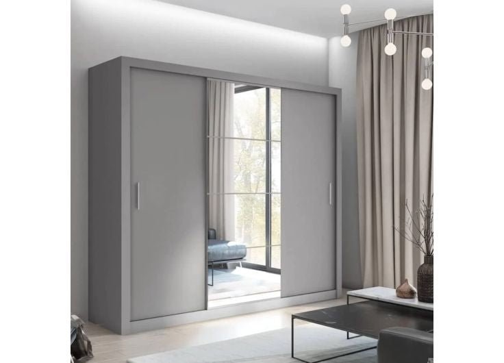 Maximise storage and style with the CHOICEWARDROBE Inverto 3 Door Sliding Wardrobe. Measuring an impressive 250cm wide, this premium wardrobe combines a modern matt grey finish with a central mirrored door to deliver both functionality and elegance. Perfect for larger bedrooms, it provides ample space for clothing, shoes, and accessories while enhancing the overall look of your room.