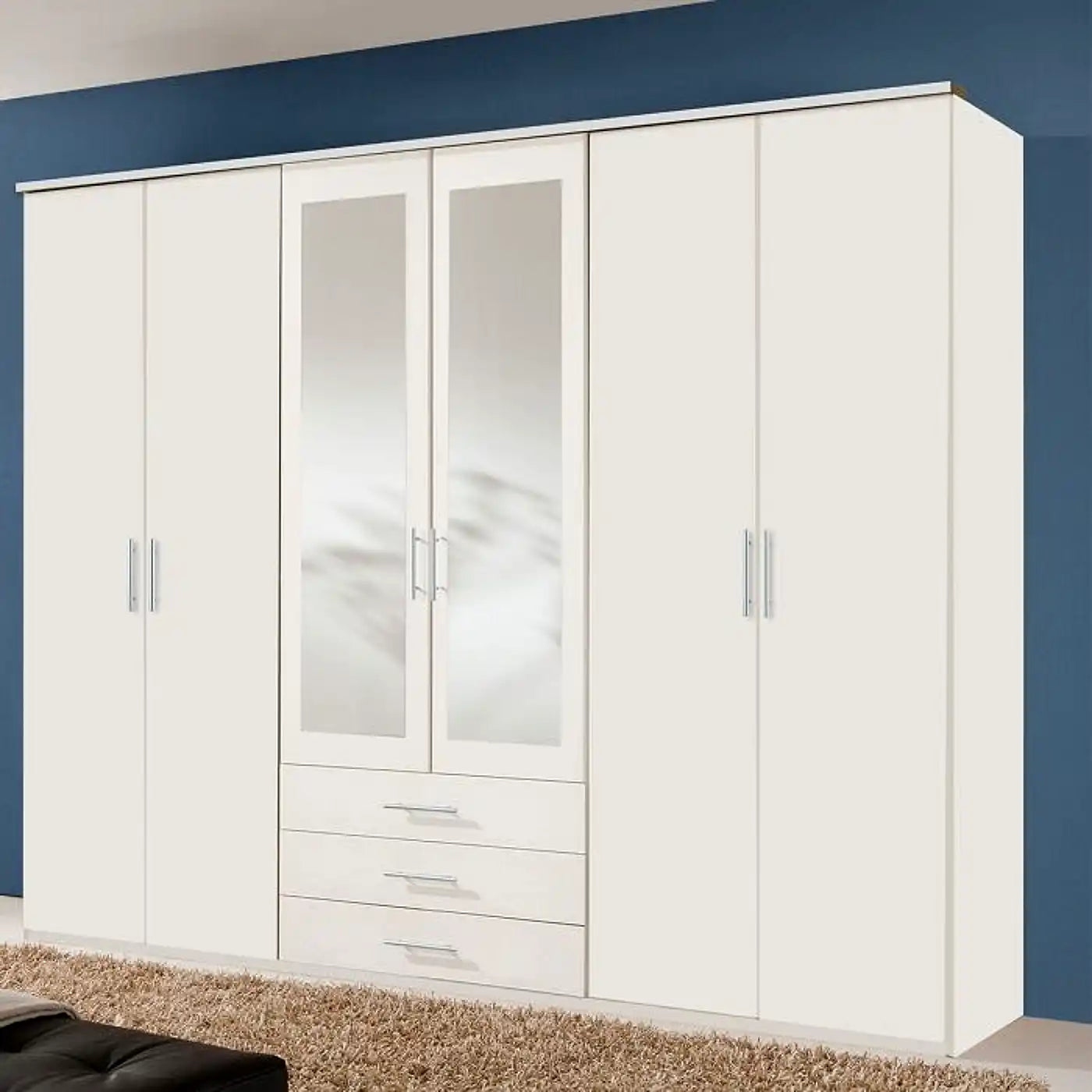 The BANHA 6 Door wardrobe has a sleek and contemporary look and comes finished in white carcass and mirrored doors.The wardrobe has trendy handles which gives it a modern look.