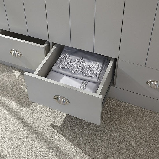The Alverton Wardrobe combines the comforting aesthetic of country living with the practicality of modern storage. Its soft grey tone pairs beautifully with natural oak-effect details, while brushed steel handles elevate the look with a modern twist. A versatile design that suits both classic and contemporary homes alike.