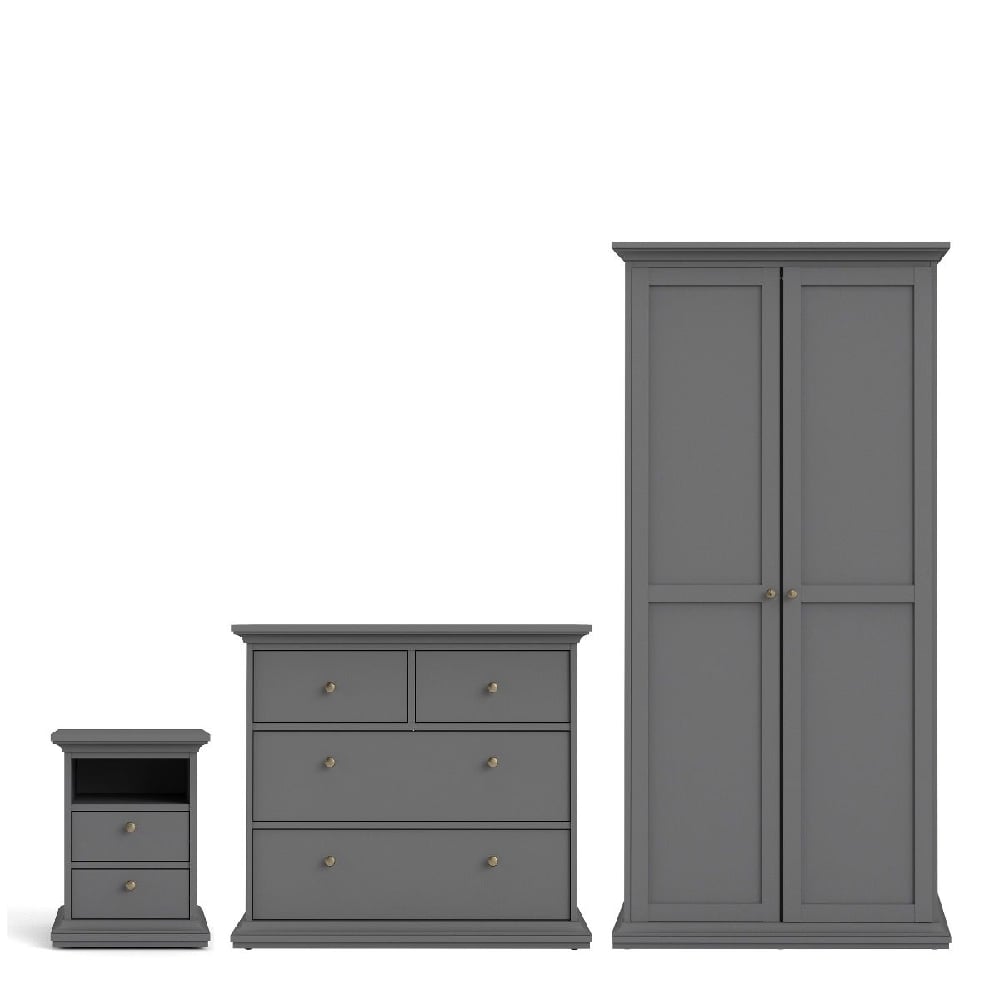 The set includes a 2-door wardrobe, a 3-drawer chest, and a bedside table — all finished in matt charcoal grey with brass handles.