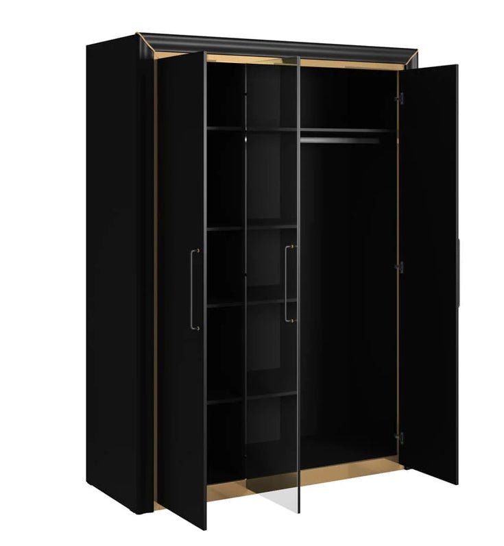 The black finish paired with gold trim creates a premium, contemporary aesthetic that works well in modern, luxury, and hotel-inspired bedrooms. It adds contrast and visual depth, making the wardrobe a strong focal point rather than a background storage unit.