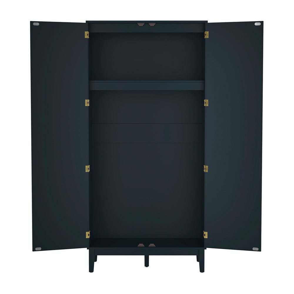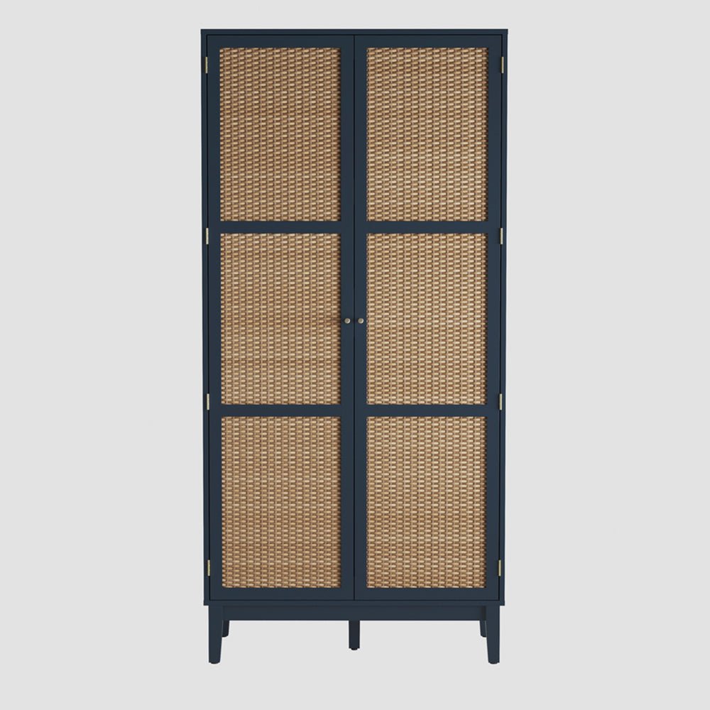 Two hinged doors form a clean, balanced elevation, finished with rattan-effect panels that introduce texture and visual warmth. The deep blue frame provides contrast and definition, allowing the wardrobe to function as a considered design element rather than a neutral background unit.