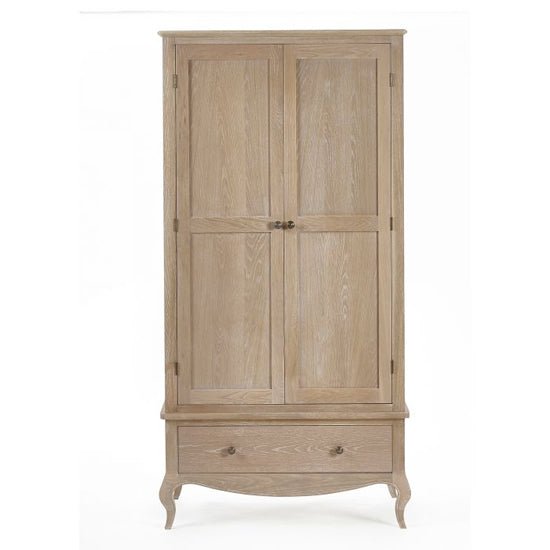 Expertly constructed from solid oak with real oak veneers, this wardrobe offers enduring durability and a premium natural finish. Behind the two panelled doors lies a spacious hanging compartment for coats, dresses, and garments, while the lower drawer provides ample storage for accessories, linens, or folded clothing. The elegant antique-style handles and curved cabriole legs complete the look with vintage charm, making it a standout centrepiece in any bedroom.
