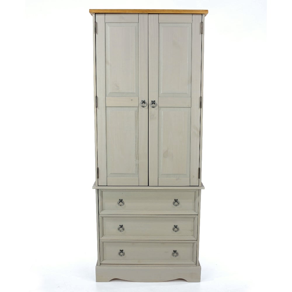 Expertly made from durable wooden materials, the Consett wardrobe features a timeless grey body paired with an oak top, exuding warmth and subtle sophistication. Behind the double doors lies a spacious hanging section for garments, while three lower drawers provide convenient storage for folded clothing, shoes, or accessories. Compact yet highly functional, it’s the perfect wardrobe for smaller spaces that still demand elegance and efficiency.