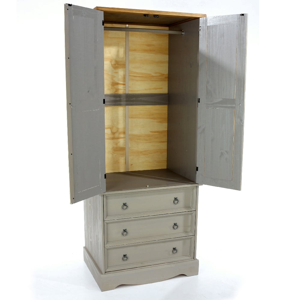 - Storage: Two full-height doors with a hanging rail and three drawers for organized clothing storage