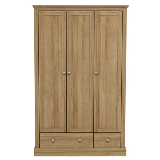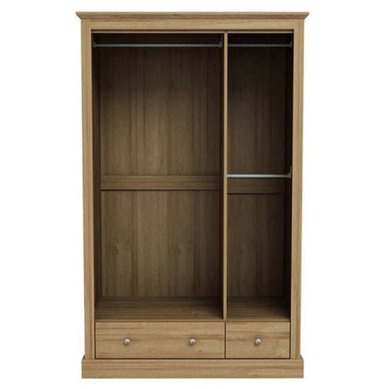 Why does the Devan wardrobe use a full oak finish in a three-door design?