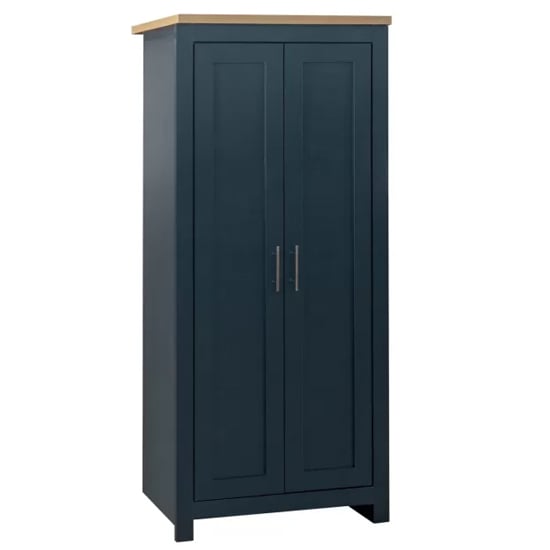 What defines the navy blue and oak finish on the Highland 2 Door Wardrobe?