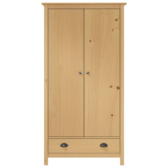 Two hinged doors create a balanced front elevation, allowing full access to the interior when opened. The natural brown finish highlights the grain and character of solid pine, giving the wardrobe a warm, authentic presence that integrates comfortably into classic, rustic, or neutral bedroom interiors.
